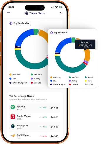 Track your earnings in detail across every platform. Yivera's revenue reports give you a complete breakdown of your income from streams, downloads, and performances.