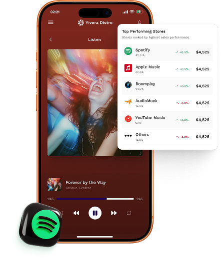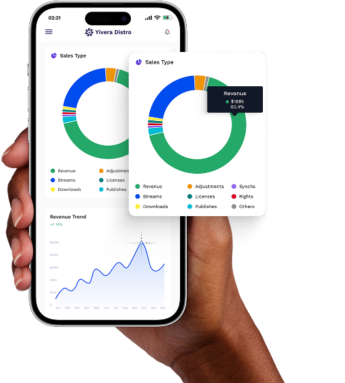 Track your earnings in detail across every platform. Yivera's revenue reports give you a complete breakdown of your income from streams, downloads, and performances.